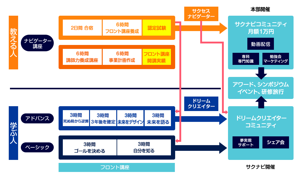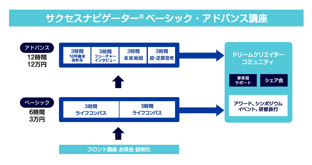 *ベーシック、アドバンス講座終了後にサクセスナビゲーター®が主催するドリームクリエーター®コミュニティ(有料)に参加する権利を得られます。